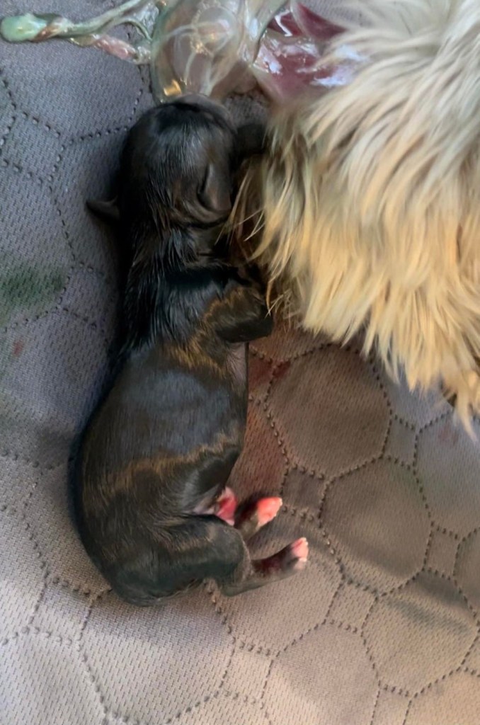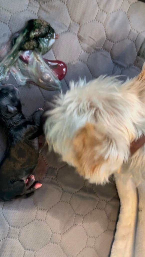 While it seems gross to us humans to have the mom eat the amniotic sac, placenta and all the leftovers, it’s actually fairly genius by design for dogs. The sac contains hormones that help her with milk production and her eating it inverts it upwards, letting any final nutrients and other good stuff for the pups pass through the umbilical cord before she removes it. The puppies nursing her also aid in her contractions to birth the other pups.