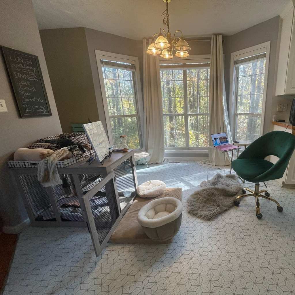 In this older home with plenty of renovation projects to do, the only feasible area that could work for whelping (breeder-talk for labor and delivery) was our unused kitchen dining area. It had a nice big bay window for plenty of natural light and the kitchen table that was there had just been given away. Since I knew (A) the puppies would spend their whole first eight weeks of life here before going to their “furever” homes and (B) we’d be taking lots of pictures and video in this area, I needed it to not only be puppy-ready but Instagram/internet-ready, too!