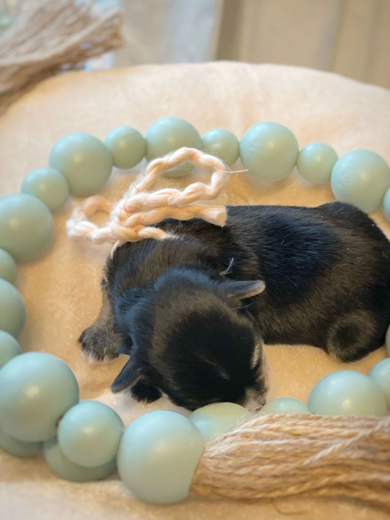 This being our first (and potentially final?) litter ever, I was quite excited to prepare for them. In addition to their whelping area, nutrition and pregnancy prep, I also managed to find some cute newborn puppy caps for them to wear in photos at some point along with some other fun photo op props. I also tried some yarn as ID collars (since I was certain, again, that the ID collars in a whelping kit or otherwise would prove to be too large) – but it turns out that their markings are enough to differentiate them. Still, the yarn bows make for lovely, sweet photos and that’s enough for me!